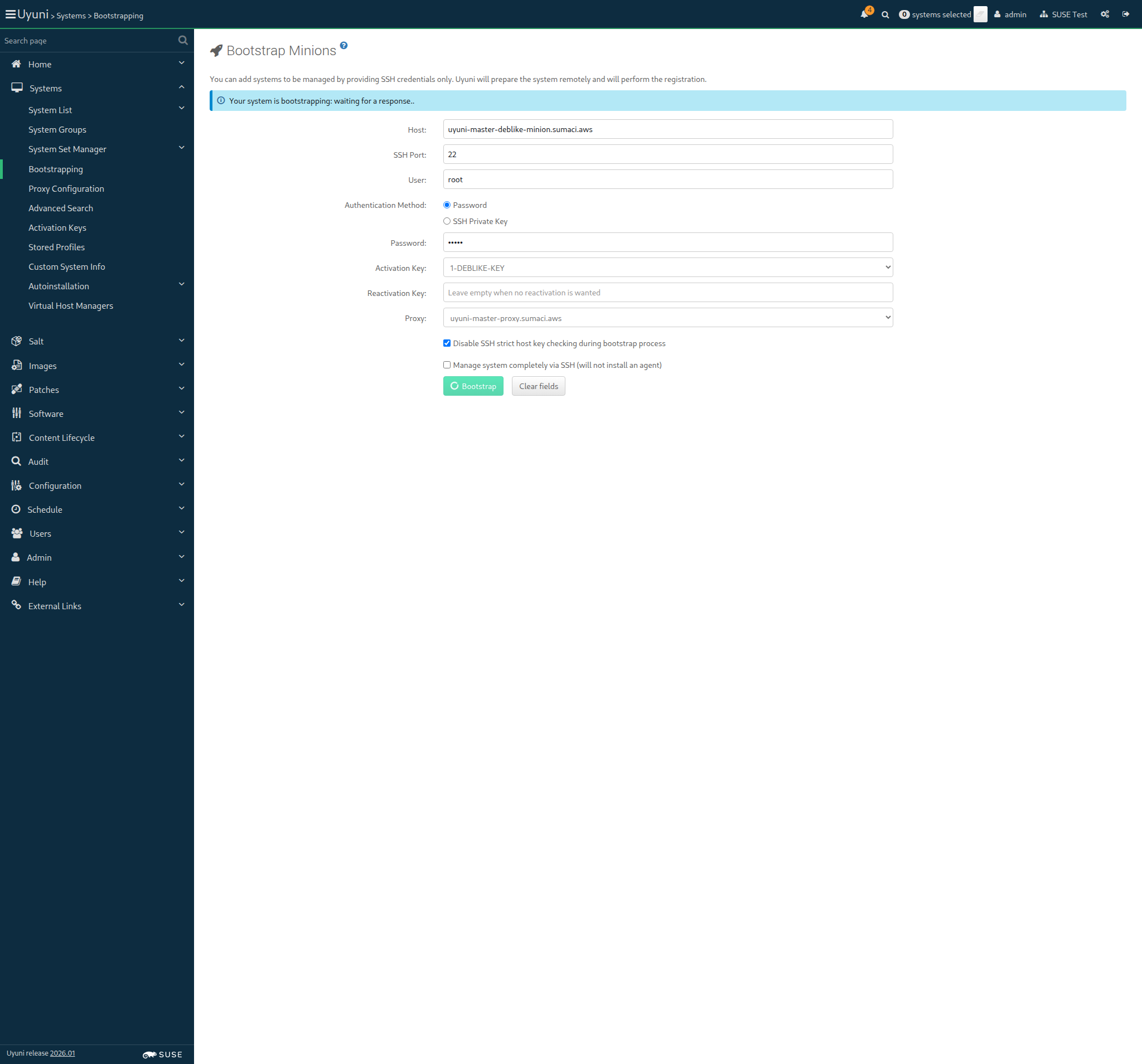 10:32:05:000 - 10:32:22:000 | Current URL: https://uyuni-master-server.sumaci.aws/rhn/manager/systems/bootstrap